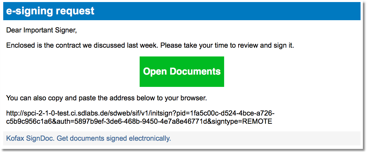 <table style="font-family:arial;font-size:12px;background-color:#FFFFFF;color:#000000;width:100%" cellpadding="5" cellspacing="5"><tr style="background-color:#%%HEADERBACKGROUND%%;color:#%%HEADERFOREGROUND%%;"><td style="width:100%;font-size:18px;font-weight:bold;">e-signing request</td></tr><tr><td><p>Dear %%SIGNERNAME%%,</p><p>%%PACKAGEMAILBODYTEXT%%</p><p>%%SIGNERACCESSCODEDELIVERYCHANNELINFO%%</p><p><center><a href="%%LINK%%" style="background-color:#00BB22;color:#ffffff;font-size:16px; font-weight:bold;font-family:Helvetica,Arial,sans-serif;text-decoration:none;line-height:40px;padding: 6px 6px 6px 6px; display:inline-block">Open Documents</a></center></p><p>You can also copy and paste the address below to your browser.</p><p>%%LINK%%</p><p></p></td></tr><tr><td style="background-color:#%%FOOTERBACKGROUND%%;color:#%%FOOTERFOREGROUND%%;width:100%;font-size:12px;" cellpadding="12" cellspacing="3"><p>Kofax SignDoc. Get documents signed electronically.</p></td></tr></table>
