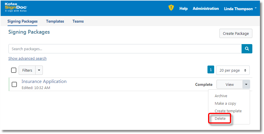 A user, which has access to a signing package, can delete the package when it is completed. It can be done in Signing Packages and Package Details views (see Void a signing package).