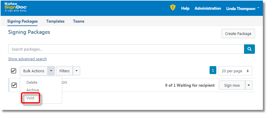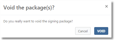 A user, which has access to a signing package, can cancel the package as long as it is not completed. It is possible to void a set of signing packages in Signing Packages view: