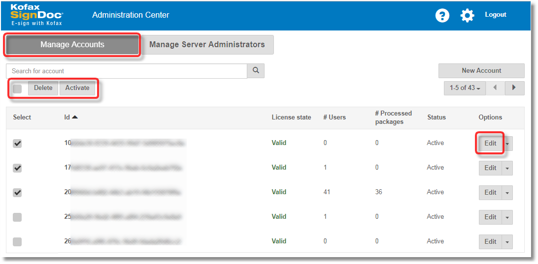 A bulk operation for account deletion and activation is available. Select the accounts that should be changed.