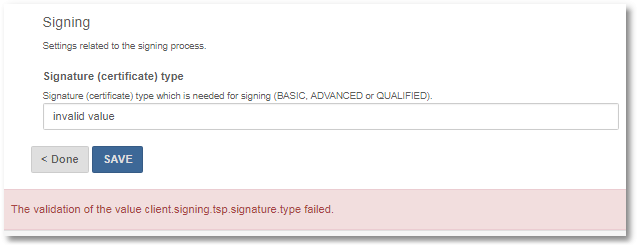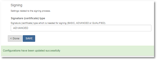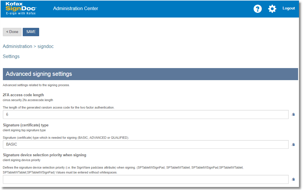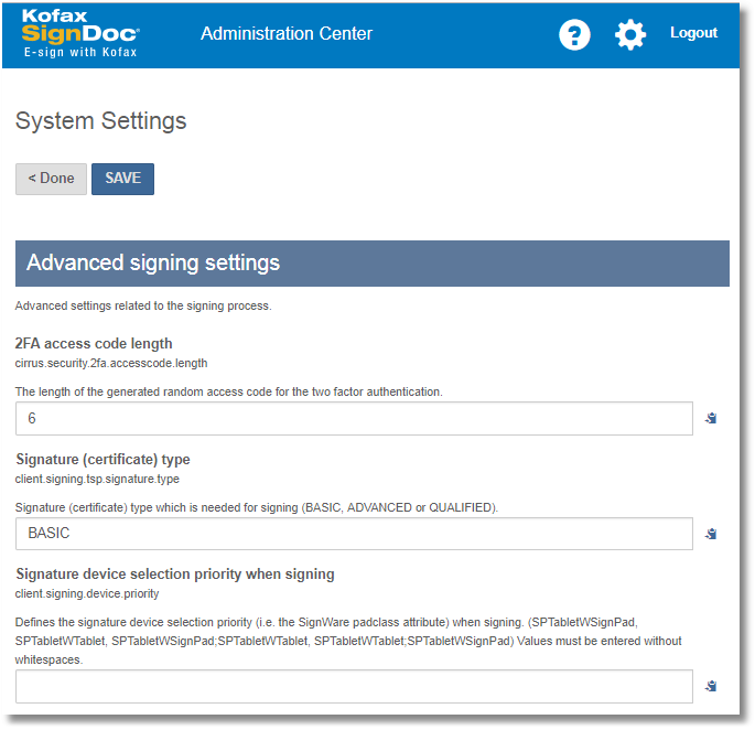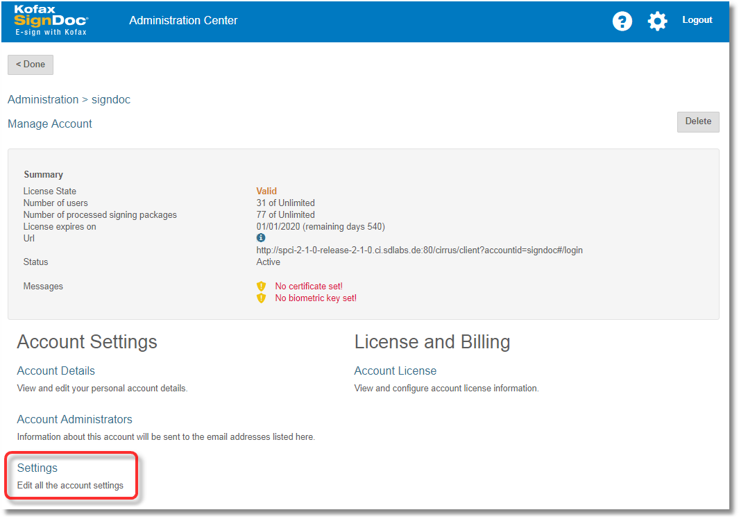 The menu includes settings related to the system, documents and packages, plugins, security, signing, and global license.