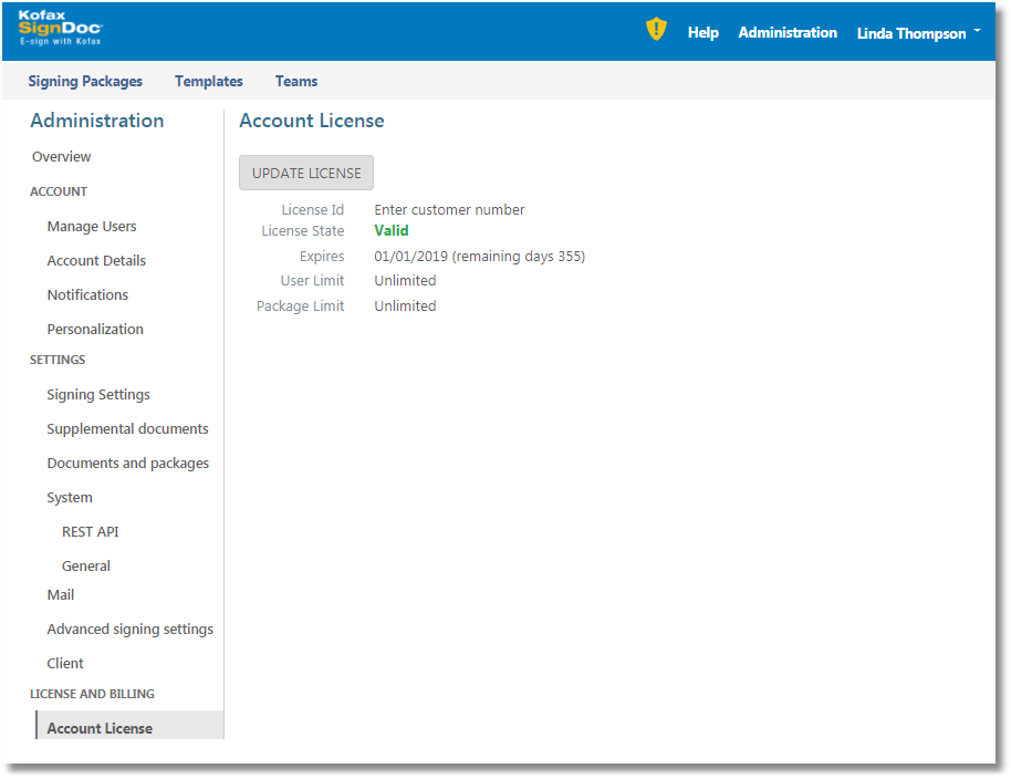 The Account License settings page provides an overview of the current license metrics, as well as an option to upload a new license (e.g. to renew, prolong, or upgrade the current account). To set a new license, click the UPDATE LICENSE button. A file browser will open that will allow you to load the SignDoc Standard license file from your local computer’s file system.