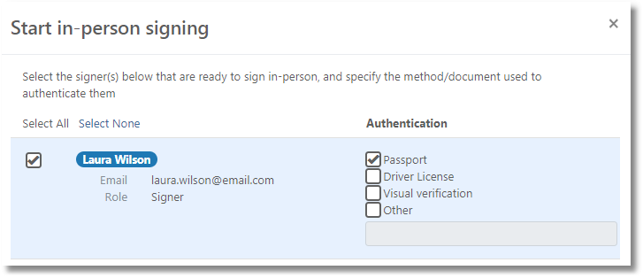 Select one or more participants for the in-person signing session. You will need to manually authenticate the signers before you can start the in-person signing session. Select one or more authentication mechanisms for each of participant. You can also add a text comment in the other field.