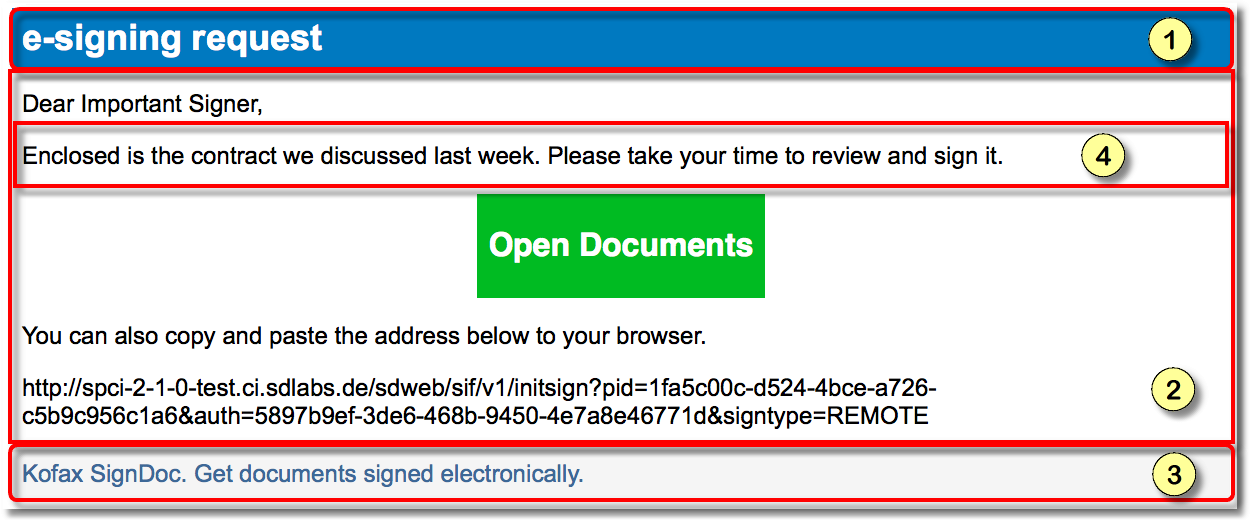 The signer notification is a more special case, since the package creator can add his own mail text as part of the signing package parameters. The signer notification mail body acts as a frame for the package notification text.