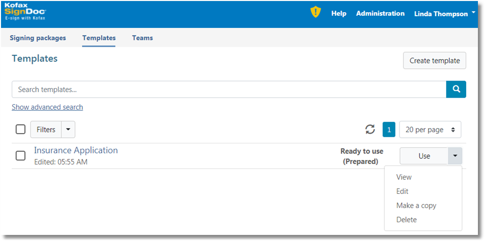 The Templates page offers a similar user interface as described earlier for the Signing packages page. Please refer to the earlier section to get more info about the filter and search functionality, the list display and the template/package details view.