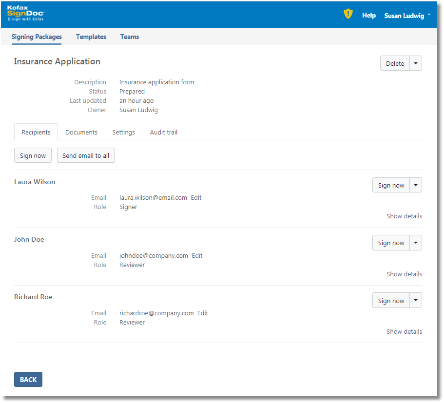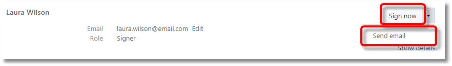 In the Recipients tab a user can start the Sign now process, see In-person signing session chapter for a detailed description.