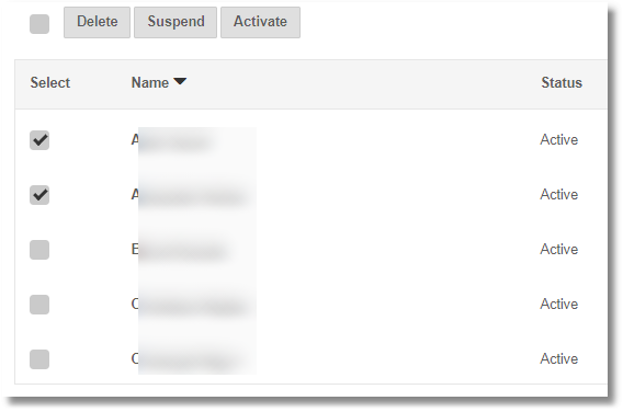 Using this option you can change the state of several account administrators at once. If one or more checkboxes are checked the Delete, Suspend, Activate buttons are visible. If you click one of these buttons the corresponding action is applied to all checked administrators.