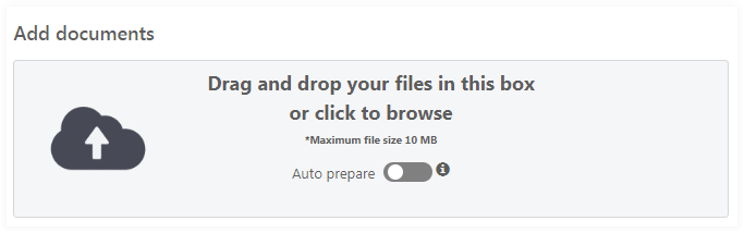 If set the document is 'auto prepared' with one mandatory signature field for each signer when upload is completed. The signature field is added to the first page of the document. The field can be manually moved anywhere within the document using the document editor, see Prepare documents.