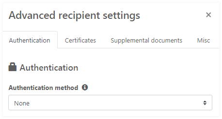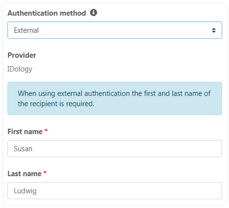 Authentication is based on an external authentication provider. This feature is only available if configured for your account. When using external authentication the recipient’s first and last name is required.