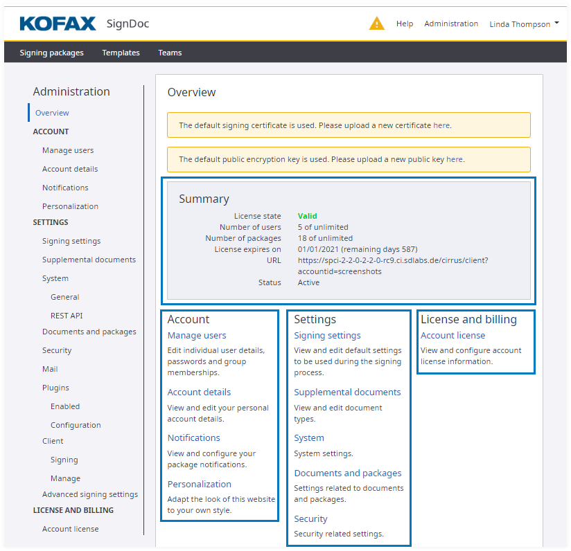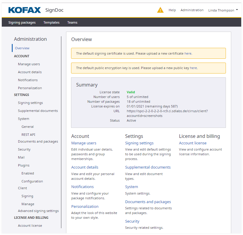 | Number of signing packages | Displays both the number of signing packages that have been created within this account, as well as the maximum number of signing packages that are permitted for this account based on the current license. |