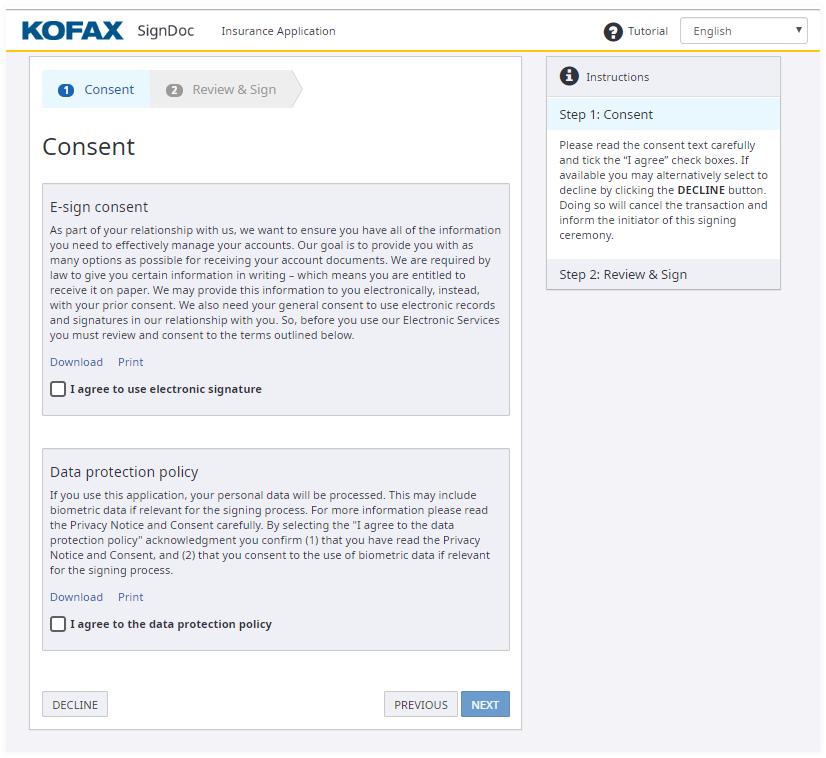 The following picture shows how this page looks like if the signer is required to accept both of consents: