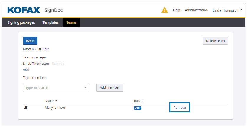 - After the team member is removed from the list of team members, click BACK to return to the Teams page.