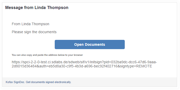 <table style="font-family:arial;font-size:12px;background-color:#FFFFFF;color:#000000;width:100%" cellpadding="5" cellspacing="5"><tr style="background-color:#%%HEADERBACKGROUND%%;color:#%%HEADERFOREGROUND%%;"><td style="width:100%;font-size:18px;font-weight:bold;">e-signing request</td></tr><tr><td><p>Dear %%SIGNERNAME%%,</p><p>%%PACKAGEMAILBODYTEXT%%</p><p>%%SIGNERACCESSCODEDELIVERYCHANNELINFO%%</p><p><center><a href="%%LINK%%" style="background-color:#00BB22;color:#ffffff;font-size:16px; font-weight:bold;font-family:Helvetica,Arial,sans-serif;text-decoration:none;line-height:40px;padding: 6px 6px 6px 6px; display:inline-block">Open Documents</a></center></p><p>You can also copy and paste the address below to your browser.</p><p>%%LINK%%</p><p></p></td></tr><tr><td style="background-color:#%%FOOTERBACKGROUND%%;color:#%%FOOTERFOREGROUND%%;width:100%;font-size:12px;" cellpadding="12" cellspacing="3"><p>Kofax SignDoc. Get documents signed electronically.</p></td></tr></table>