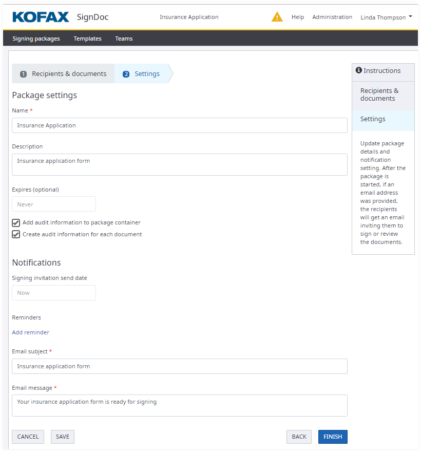 - Email reminders are sent to recipients if they haven’t yet completed the signing package.