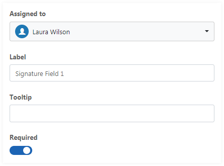 Select the signer and add fields by dragging and dropping from the panel into the document body. The following fields types can be added: