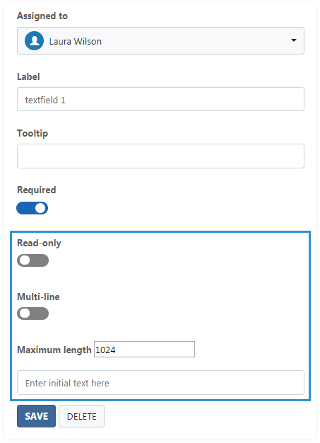 Fields can be moved by dragging and resized using the field edges. The field can be deleted from the field properties panel.