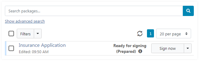 By default the advanced search panel is hidden. The signing packages list contains signing packages created by the authenticated user, with any state except for archived, for the whole period.