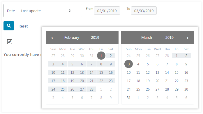 In case filter parameters are set and the advanced search panel is hidden, a contextual message is displayed with current parameters and a button to reset filters: