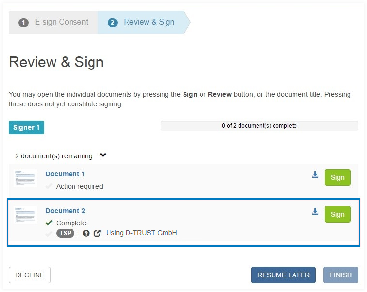 In the Documents section, it is shown that the document has to be signed with TSP signature.