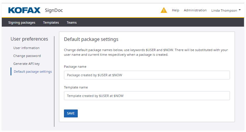 On this page a user can change default package settings, which are used on package/template creation. These settings can be updated also during the signing package creation process.