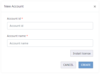Insert the Account id and the Account name of the new account and click Install license. Select the license file for the account.