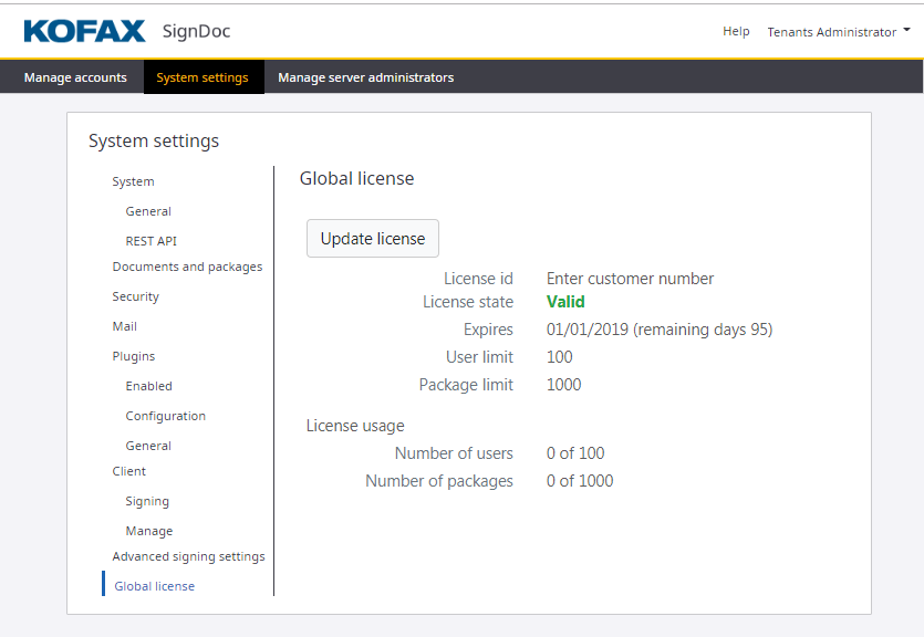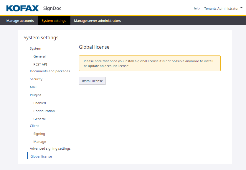 To install a global license open the Administration Center, log in as a server administrator, go to the System settings link and select the Global license category.