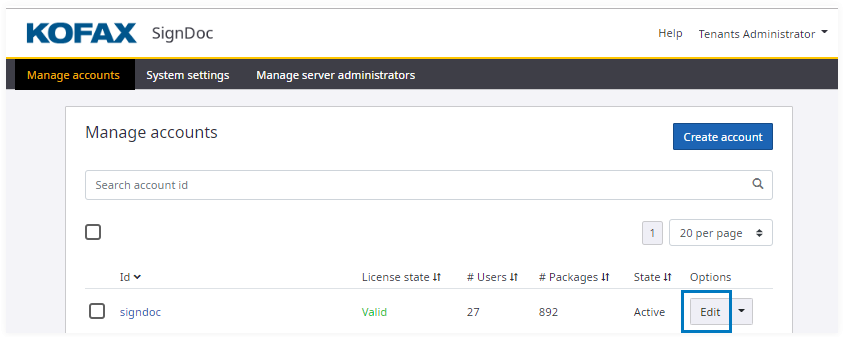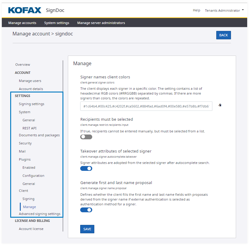 The System settings menu is displayed which includes settings related to the system, documents and packages, security, mail, plugins, signing, and global license.