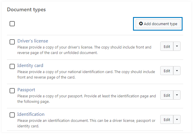 An account administrator can manage document types assigned to an account. A document type is a template which defines a group of supplemental documents.