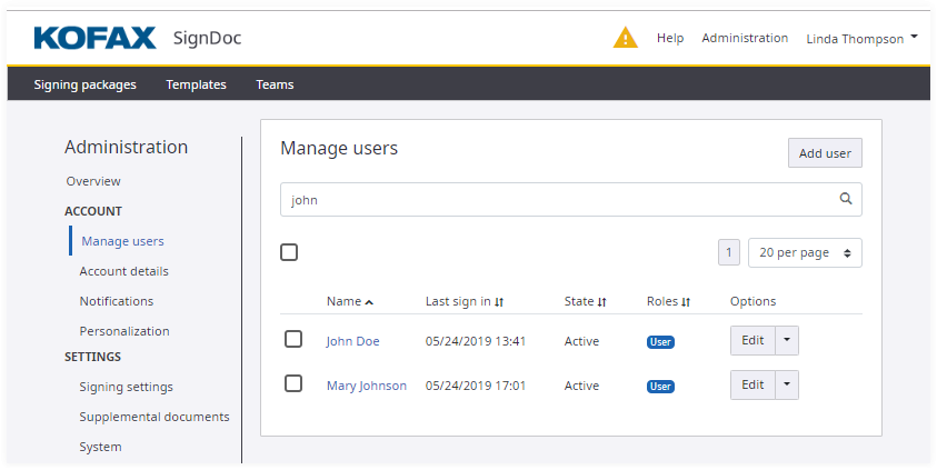 In this section, the account administrator assigns roles to users. With the role User, only signing packages can be accessed. With the role Team manger, additional teams can be created and modified. The role Administrator has full access to the account.