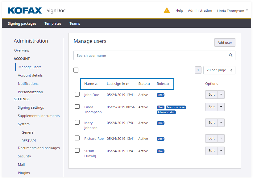 Users can be sorted by the columns Name, Last sign in, State, Roles.