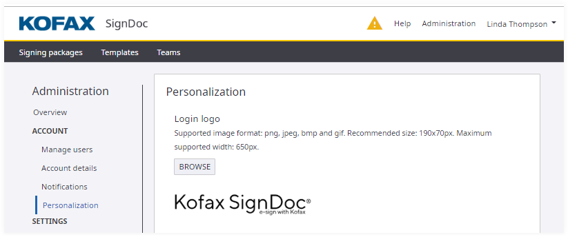 The personalization is visible to both the package owners and signing package recipient. Using the personalization options, you can set logos, headers, and footers.