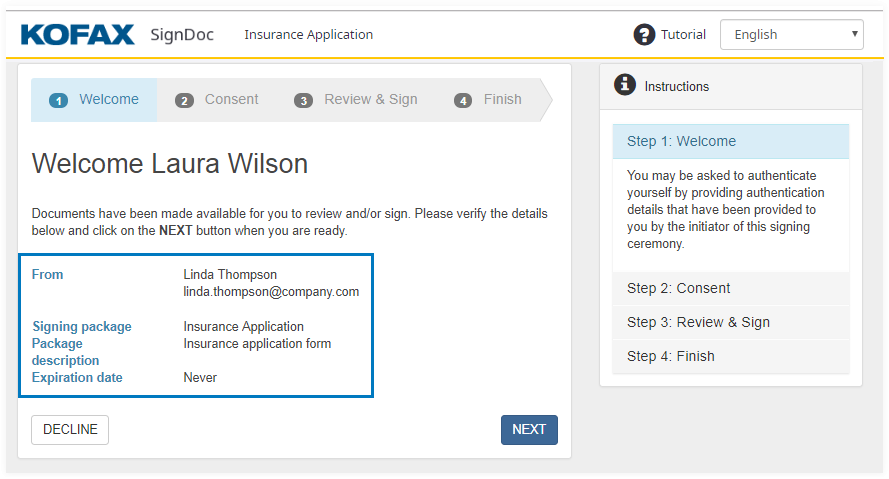When the recipient clicks the link or Open Documents, the SignDoc Standard guided signing and review process is started. This page informs the recipients about: