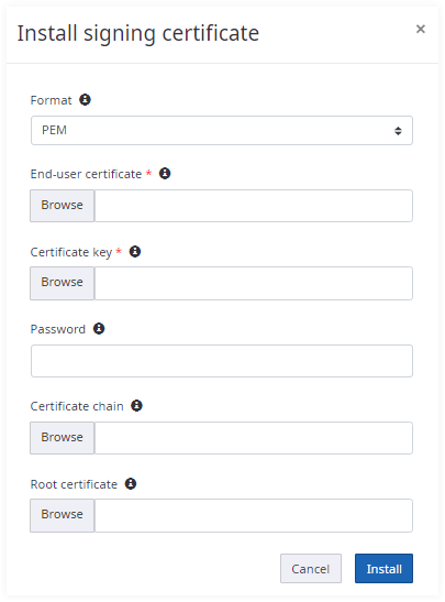 This is the digital signing certificate that is used for each SignDoc Standard signature placed in a document. Click Install certificate to browse the local file system to select and upload the digital certificates. Once uploaded, the selected certificates are used for all signing procedures.
