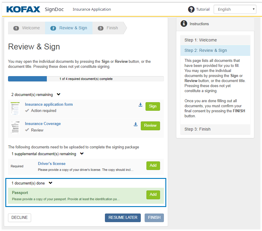 Once all required supplemental documents are provided and all documents of the signing package are completed, the Finish action is available for the signer.