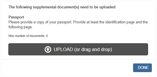 For some services such as consumer loan applications, signers are required to upload supplemental documents during the signing process. Examples of such documents are scans of ID documents (driver's license, photo ID), proof of residence, or proof of income (pay slip).