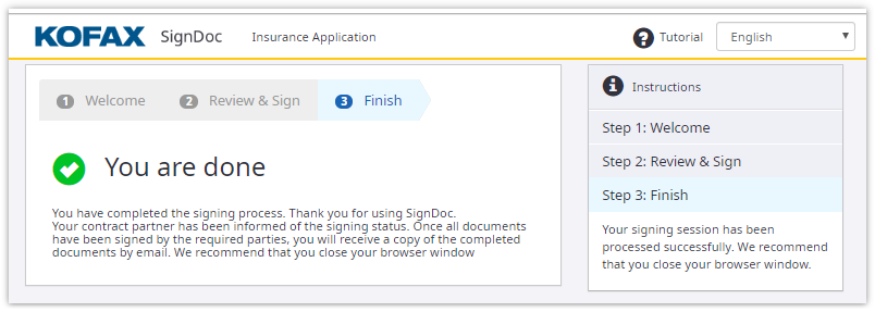 The Finish page shows that the signing session has been processed successfully.
