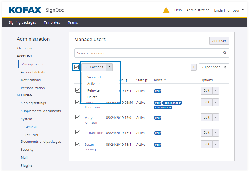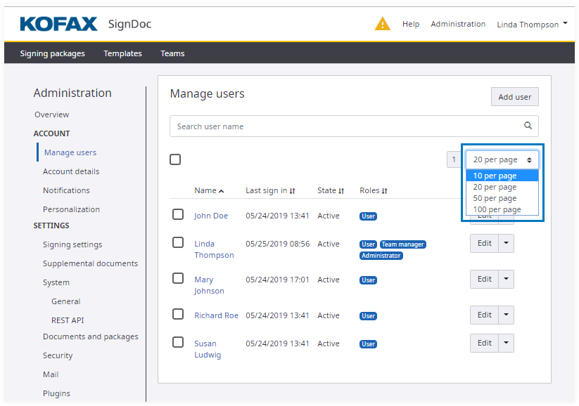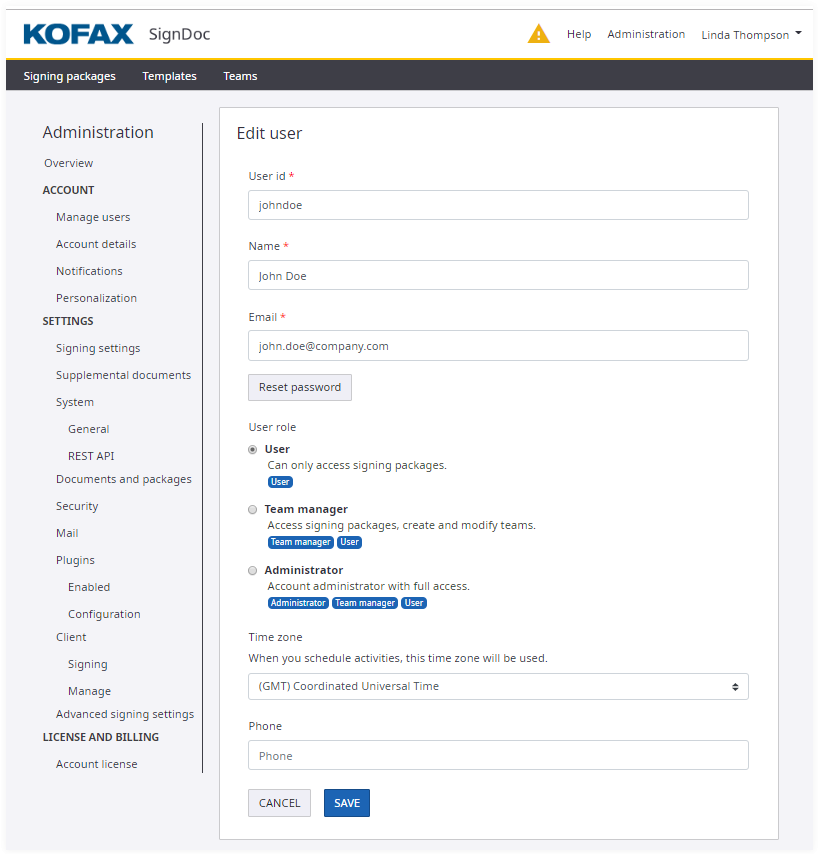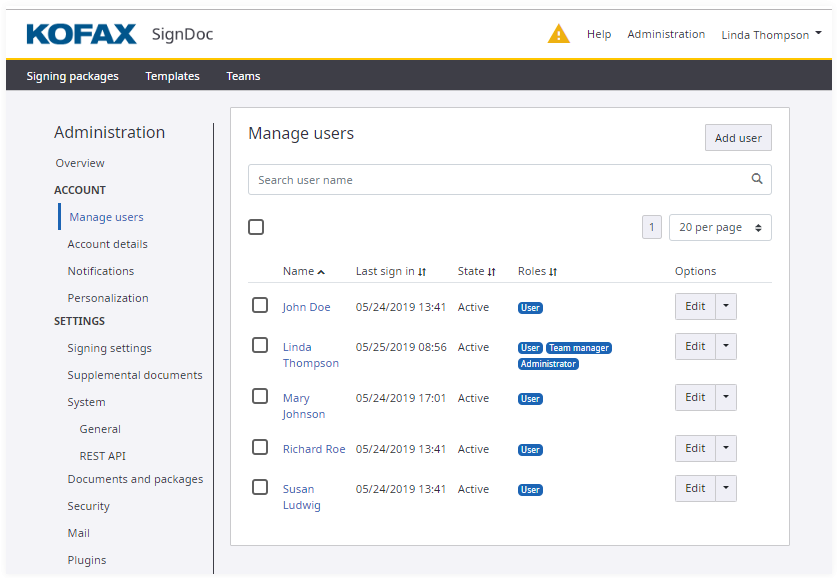 In this section, the account administrator assigns roles to users. With the role User, only signing packages can be accessed. With the role Team manger, additional teams can be created and modified. The role Administrator has full access to the account.