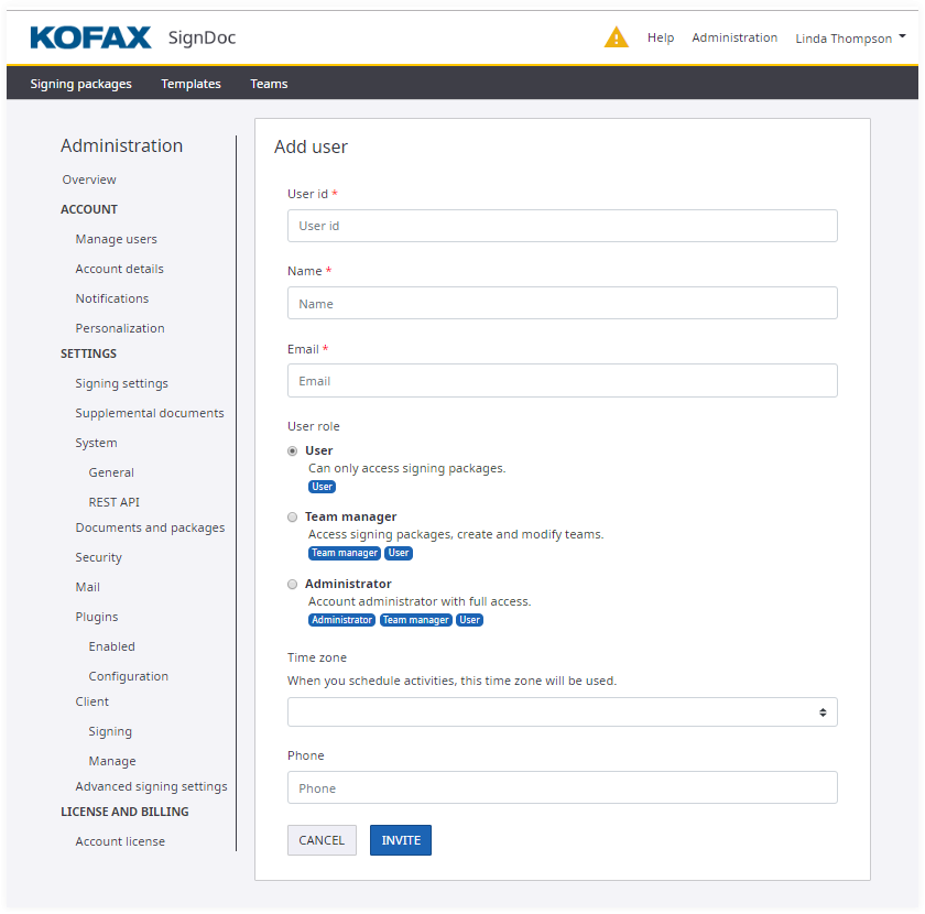 Enter the fields requested for creating the new user and select the preferred user roles. Select a time zone and enter a phone number. Then click Invite.