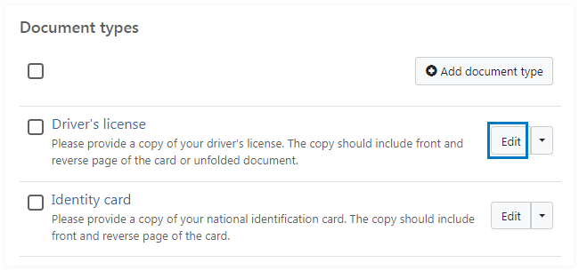 An account administrator can manage document types assigned to an account. A document type is a template which defines a group of supplemental documents.