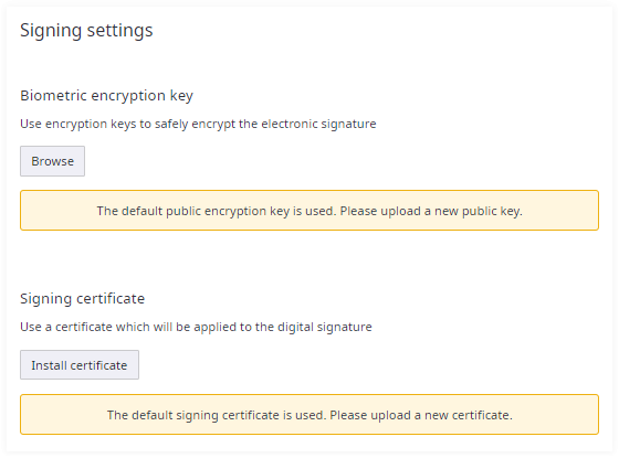 If no biometric key is set here, a default biometric key is used, and a warning appears at the top of each SignDoc Standard page instructing the administrator to update the biometric key.
