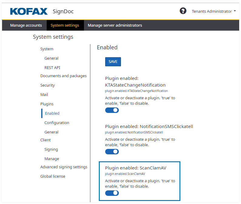 Slide the Plugin enabled: ScanClamAV setting to the right to activate it: