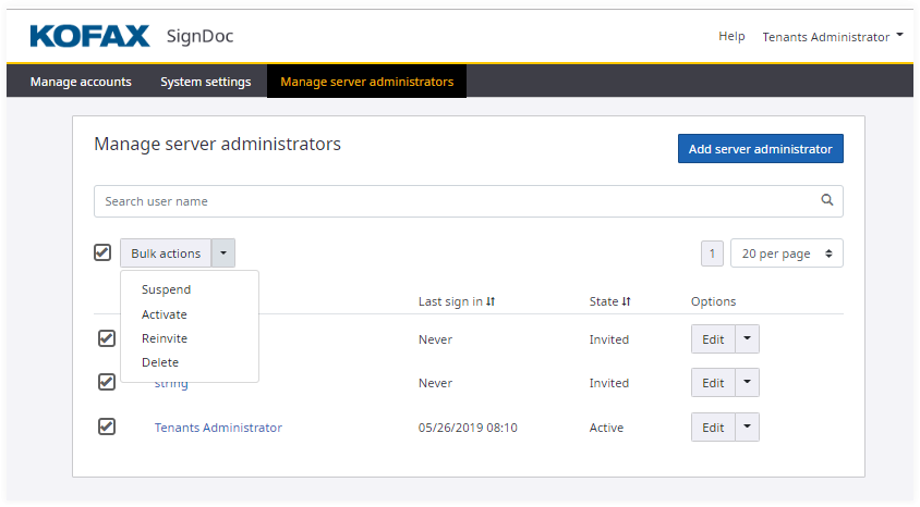 Use this action to change the state of several server administrators at once. If one or more check boxes are selected the Suspend, Activate, Reinvite and Delete buttons are visible. If you click one of these buttons, the corresponding action is applied to all checked administrators.