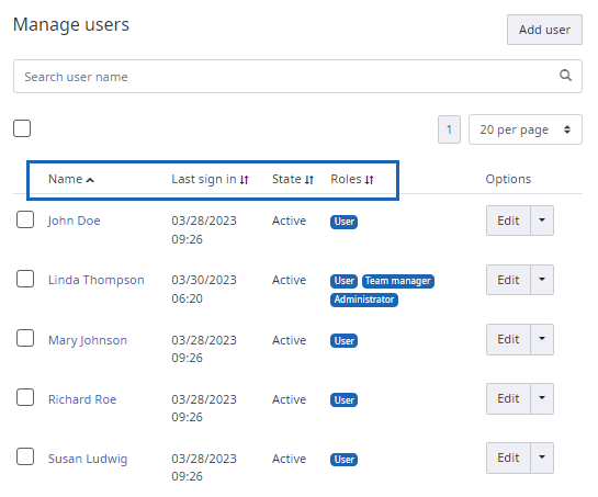 Users can be sorted by the columns Name, Last sign in, State, Roles.