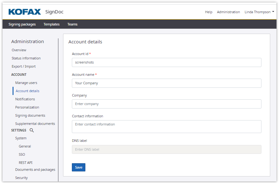 This label allows this SignDoc Standard account to be accessible via a subdomain. For example, if your company’s account should be accessible via the URL yourcompany.kofax-signdoc.com, the label "yourcompany" appears in the DNS label field. This field is configured upon creation of this account by the server administrator and is not editable.