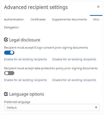 You can update (enable or disable) the E-sign consent and data protection policy consent setting for the selected signer. You can also use the action links Enable for all existing recipients or Disable for all existing recipients to enable or disable the requirement for all currently existing recipients defined in the package. If you do not update these settings, the application requires consent according to the configured settings. Please note that after adding new recipients to the package the action links must be triggered again.