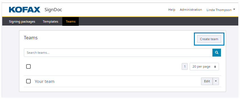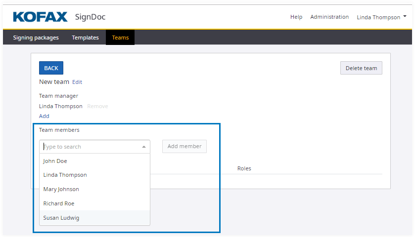 - Define a team manager. The account administrator creating the team is set as default. Add a
