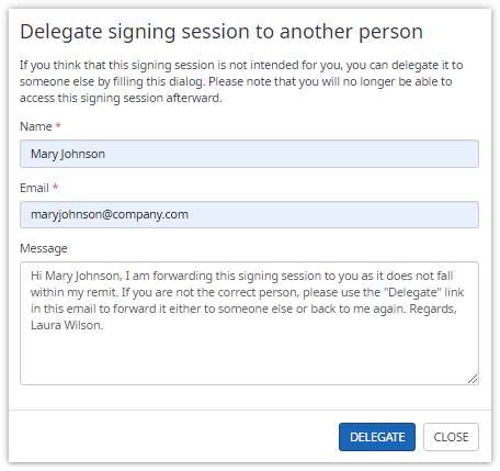 If delegation is enabled for a recipient, the recipient can delegate the signing session to another person at any time. The recipient has to provide the name and the email of the person to whom the signing session should be delegated.
