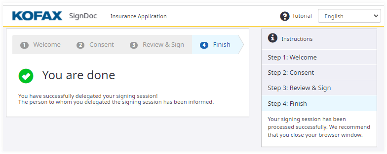 Finish page. The recipient sees a message that the signing session has been