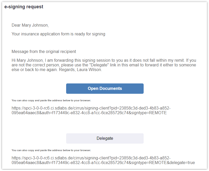 The person to whom the signing session is delegated receives a signing invitation email. This email includes the message