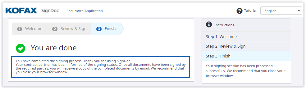 After the in-person or remote signing session is finished, a confirmation message appears on the Finish page by default. In this case we recommend that you close your browser window. For external signing session the specific URL could be set in Administration settings to redirect the recipient after the signing session is finished.